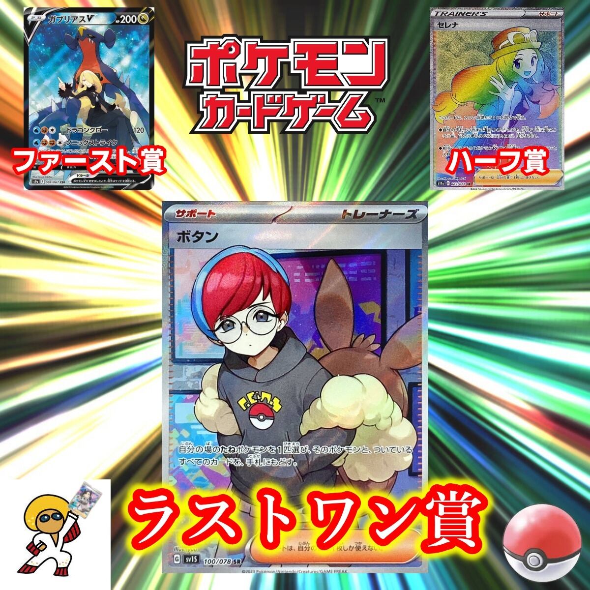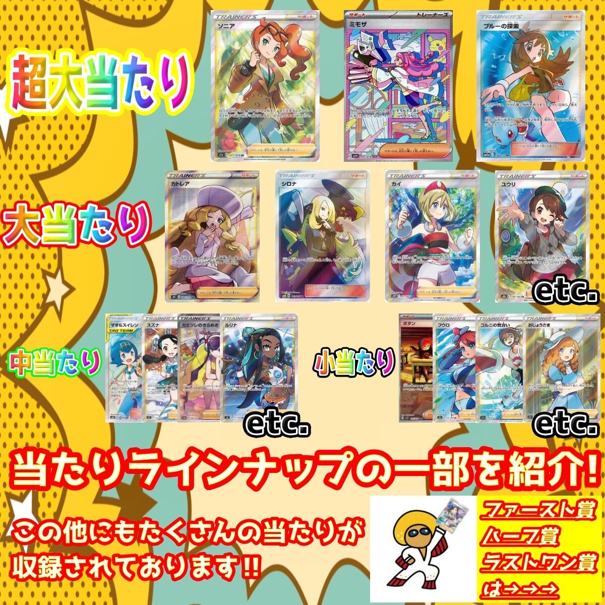 ファースト賞等 各賞を当てていただいた方はレビューかTwitterもしくは両方でご報告いただけますと幸いです。当たり枠を引き当てた方にも同様にお願いしたいのですが、超大当たり枠(画像2枚目参照)については他の購入者様の開封の楽しみを損なう可能性がございますのでオリパ完売後のご報告をお願いしております。