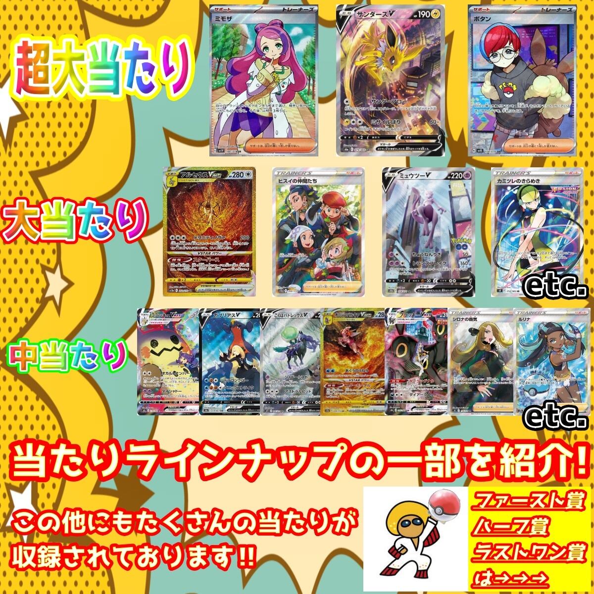 ファースト賞等 各賞を当てていただいた方はレビューかTwitterもしくは両方でご報告いただけますと幸いです。当たり枠を引き当てた方にも同様にお願いしたいのですが、超大当たり枠(画像2枚目参照)については他の購入者様の開封の楽しみを損なう可能性がございますのでオリパ完売後のご報告をお願いしております。