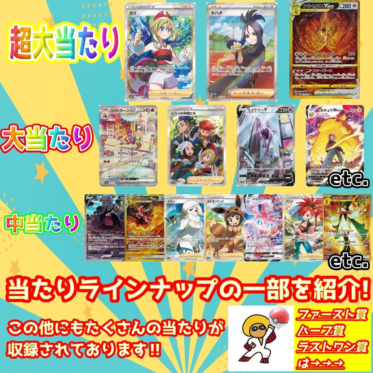 ファースト賞等 各賞を当てていただいた方はレビューかTwitterもしくは両方でご報告いただけますと幸いです。当たり枠を引き当てた方にも同様にお願いしたいのですが、超大当たり枠(画像2枚目参照)については他の購入者様の開封の楽しみを損なう可能性がございますのでオリパ完売後のご報告をお願いしております。